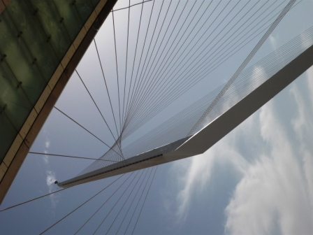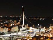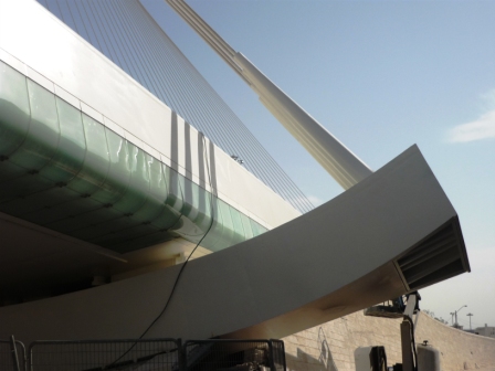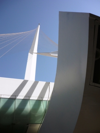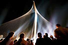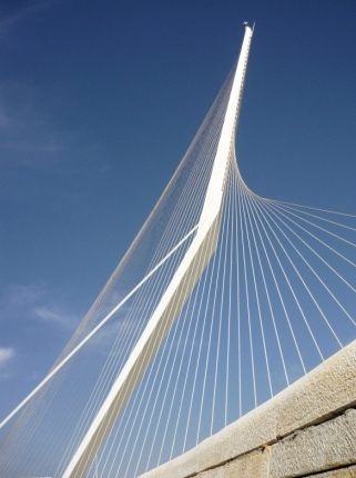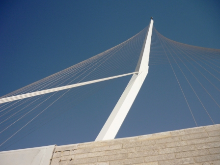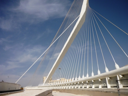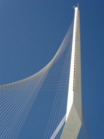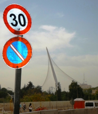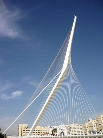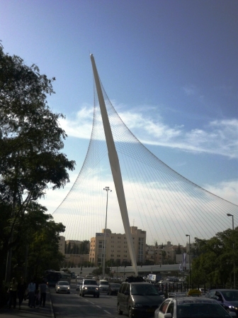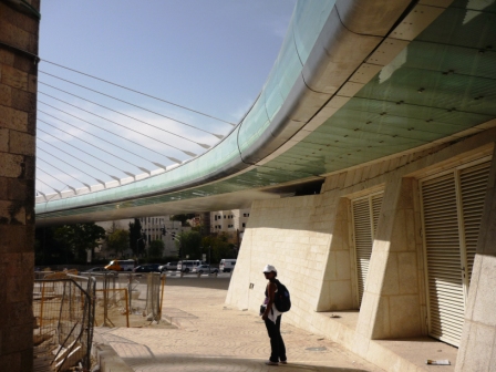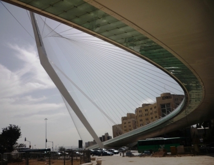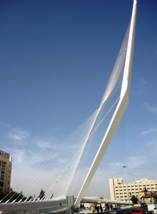 El principal ícono de Israel y el judaísmo es el Rey David (el mismo del cuento de David y Goliat). David (c. 1040 a. C. - 970 a. C.) fue rey israelita, sucesor del rey Saúl y el segundo en reinar el antiguo Reino de Israel, fue padre de uno de los más grandes gobernantes de Israel: Salomón. Y es aquí donde conectamos con el Puente de Calatrava. A finales de los 90, el entonces alcalde, Ehud Olmert (luego primer ministro) le dijo al escultor y arquitecto valenciano: "Has diseñado muchos puentes en todo el mundo y tienes una carrera llena de éxitos pero hacer una obra en Jerusalén es algo especial, de máxima responsabilidad. Debe ser el puente más simbólico y bonito del mundo" Durante 3 años se erigió un puente para tranvía con la forma de una estilisada y monumental Arpa de David, que junto a la Estrella de David, son los síbolos más preciados del judaísmo. Es un "puente atirantado", cuyos cables semejan las cuerdas de un arpa antigua, unidas a un mástil articulado supendiendo la pista de rodamiento que con sus bordes en vidrio curvado, pista que sugiere con sinuosidad y extensión las melodías del Rey David. ...Genial, ...no te parece? El día de la inauguración (25 de julio del 2008) aún sin concluir (igual que en Costa Rica), después de 1 año de atraso y el doble de lo presupuestado (como en todo lado), de la única obra importante en Jerusalén después de 2000 años, el genial arquitecto español dijo: "El puente que inauguramos está sostenido desde arriba expresando el carácter de Jerusalén que vive de los designios de arriba" Exclama el alcalde, el ultraortodoxo, Uri Lupolianski, sentado en una modesta mesa que el Ayuntamiento ha colocado en la pasarela peatonal del nuevo puente: "Gracias, genio, Gracias, Santiago Calatrava" Lo que no sospecharon las autoridades de Jerusalén, fue que tal genialidad, llevaba el veneno de la fama, y ahora según Samuel (un vecino del barrio), respecto a la iconografía judía ironiza: "...al Rey David y al Rey Salomón, ahora debemos agregar al Rey Calatrava". Unas fotos que tomé por allí y quiero compartir con ustedes, espero las disfruten: