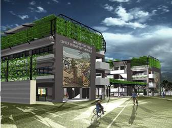 ASPECTOS OBJETIVO PARA LA CONSTRUCCIÓN SOSTENIBLE Cambio cuantitativo y sostenible Además de edificio escolar, contribuye educando a los usuarios y espectadores, con un nuevo enfoque de responsabilidad medio ambiental, operación y mantenimiento sostenible. Al ser repetitivo en lo básico, permite evaluación horizontal y vertical: a través del tiempo y comparando resultados con otras comunidades, incluso entre edificios, aulas y respecto al sistema tradicional. Las experiencias acumuladas son mejorables y transferibles, es de esperar que en la comunidad repliquen para otros usos las técnicas observadas aquí, que aportan resultados estéticos y económicos eficientes. La sustitución de escuelas de una planta, por edificios con sótano, planta baja libre, varios niveles de aulas, azotea como área verde y un notorio techo vegetal, constituyen una innovación urbana y paisajística de impacto. Normas éticas y equidad social El proyecto es básico y se completa con la participación del lugar donde se implanta, mediante un proceso que define sus valores y simbolismos aplicados al edificio mediante un mural, para consolidar la identidad cultural. Su conceptualización, programa arquitectónico, construcción y gestión implica a todos los actores sociales de la comunidad específica (alumnos, docentes, padres de familia, líderes comunales y gobierno), lo que obliga a que todo se haga bajo las normas éticas y legales de seguridad, transparencia y equidad, como base del progreso y bienestar en función de la responsabilidad social. Como proyecto modular, gran parte del proceso constructivo se hace bajo control industrial, permitiendo la certificación de materiales y métodos, así como de cumplimiento de las leyes de equidad y seguridad. Calidad ecológica y conservación de energía El material en un 90% son de procedencia regional, 80% reciclables. La energía para construir y operar es hidroeléctrica, pero se usa climatización pasiva y energía solar. Minimiza el uso de agua del servicio público y su efluente es libre de fosfatos. Los materiales son duraderos y seguros. Se optimiza el uso del suelo, dejando libre casi todo el terreno e incorporan las azoteas y muros como área verde. Rendimiento económico y compatibilidad Como construcción vertical intensiva reduce los costos iniciales por compra de terreno y los operativos en el ciclo de vida. El diseño es básico, modular y flexible, adaptable todos los cambios y demandas posibles en su uso. Mobiliario hecho a base de materiales reciclados en talleres comunales Por su equipamiento y materiales, su operación reduce mucho el consumo energético, agua y mantenimiento. Respuesta contextual e impacto estético El diseño expresa la idiosincrasia local, usos e identidad cultural, privilegiando la educación como un juego, la vida en espacios abiertos (aunque sea urbana), la responsabilidad social en el uso y rescate del amor ancestral por la agricultura y la auto supervivencia. Utiliza la vegetación mostrándola en ventanas y los tejados para integrarla suavemente al horizonte verde, con el efecto de “borde infinito” integrándola al paisaje. Diseño para todo el ciclo de vida del edificio Participación de todos los actores involucrados y redacción del proyecto considerando todas la etapas: nacimiento , vida y desecho del edificio: -Formulación del programa arquitectónico