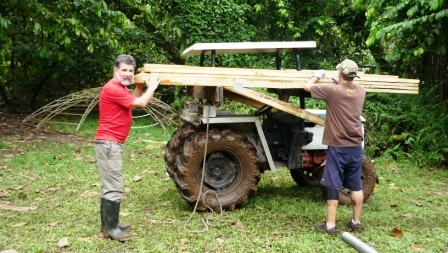 Sale brevemente el sol, justo para que los voluntarios se instalen, observen las facilidades disponibles en la isla, se reinicie la pertinaz lluvia, bajo la cual se empieza el traslado de los materiales, el trazado de la obra y la colocación de los primeros pilotes.