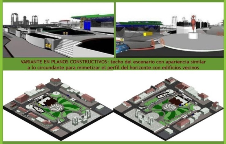 El quiosco existente fue hecho con carácter provisional, sin calidad técnica y estética que armonizara con el casco urbano, su altura de piso genera ángulos visuales inapropiados para la presentación de espectáculos y sus dimensiones son limitadas al efecto. Debajo cuenta con un semisótano usado actualmente como archivo, pero que por filtraciones incorregibles se está en proceso de desalojo. Tiene un alto estado de deterioro.