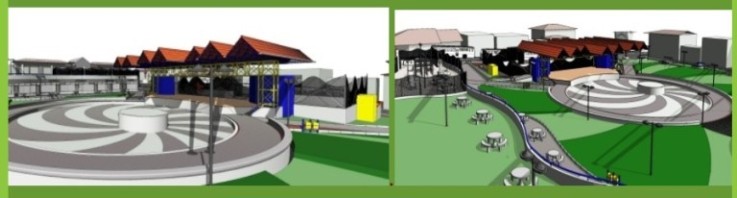 Como ampliación de las posibilidades del anfiteatro se provee EL ESCENARIO EMBRUJADO, tarima fija de 168 m2 a un metro de altura, para hacer presentaciones de mayor tamaño, como orquestas, teatro, conciertos, celebraciones comunales, cabildos abiertos, etc., etc. El escenario es techado y cuenta con gradas, rampas y vestidores. También se prevé sistema de iluminación y sonido, así como anclajes para múltiples telones y escenografías.