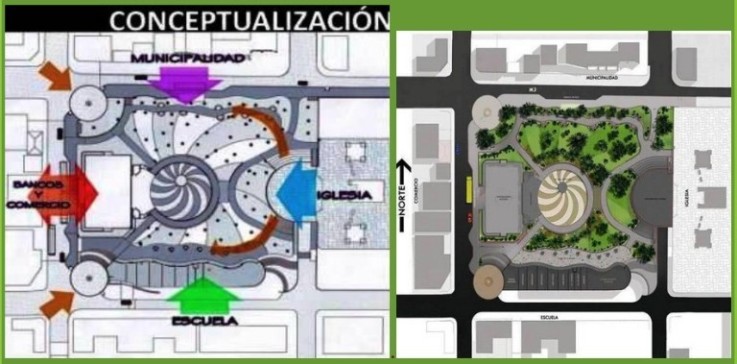 Alrededor del Parque están representadas las instituciones sociales que por excelencia reflejan la tradición de la organización socio económica del pueblo, de lo cual derivan sus valores y principios de interrelación social: la Iglesia, la Escuela, la Municipalidad y el Comercio. Así que se busca una expresión formal dentro del Parque donde se perciba la convergencia como extensión constructiva de la Fe, la Educación, la Administración Pública y los Servicios. Se concibe el Parque como punto de encuentro y catalizador de las fuerzas sociales.