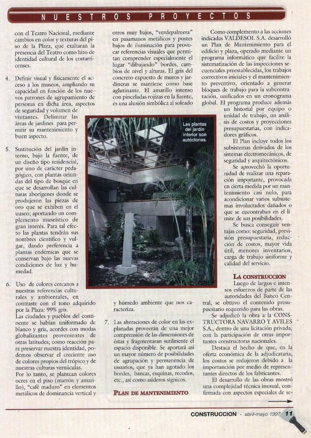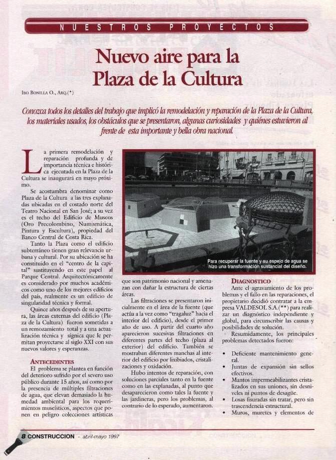 La Plaza de la Cultura es el hito urbano y cultural por antonomasia, de la capital del país. Su trascendencia radica en varias facetas: alberga los museos más emblemáticos de la cultura costarricense (oro precolombino, numismática, arte contemporáneo), es el punto neurálgico de los encuentros urbanos, sirve de antesala al Teatro Nacional y es una de las pocas perspectivas urbanas de San José. Ha sido un honor el haberme otorgado la responsabilidad de actualizar y remodelar este espacio, ajustándolo a las nuevas exigencias urbanas y técnicas de protección.